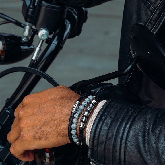 Das Armband Yuki kombiniert schwarzes, rund geflochtenes Leder mit fein gearbeiteten Details aus matt silberfarbenem Edelstahl. In der Mitte des Armbands setzen verschiedene, schmale Edelstahlelemente dezente Akzente und verleihen dem Design Tiefe und Struktur – stilvoll, modern und maskulin.