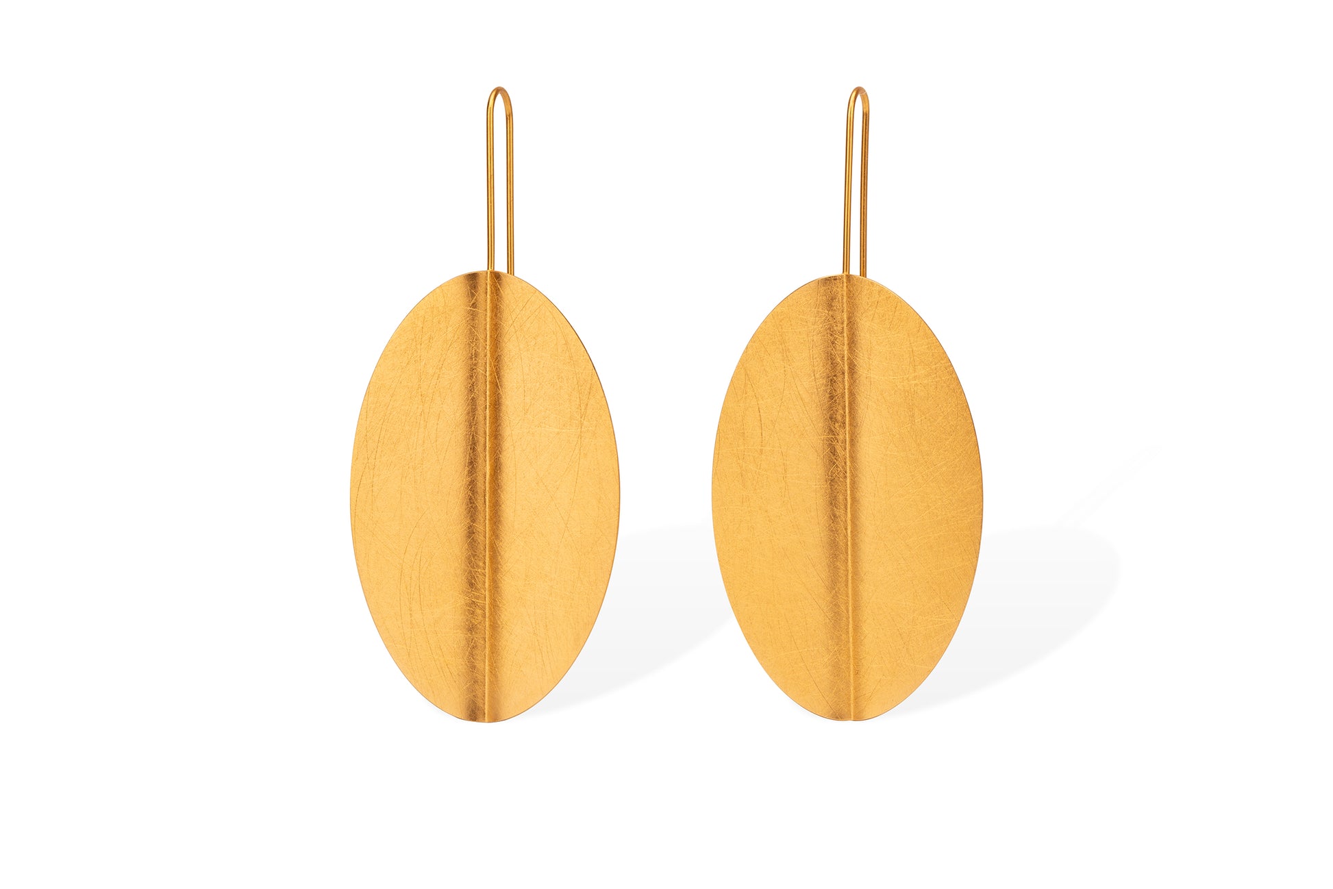 Diese eleganten XL-Ohrringe sind aus 925er Sterlingsilber gefertigt und mit edlem Gold plattiert. Das klare, länglich-ovale Design (30 × 48 mm) mit fein gebürsteter Oberfläche wirkt modern und ausdrucksstark zugleich.