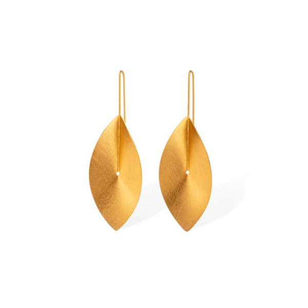 Diese eleganten Ohrringe von Zaremski sind aus 925er Sterlingsilber gefertigt und mit einer edlen Vergoldung veredelt. Ihr längliches, blattförmiges Design mit fein gebürsteter Oberfläche verleiht ihnen eine natürliche Leichtigkeit und gleichzeitig modernen Chic.