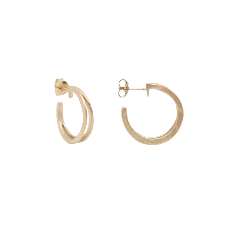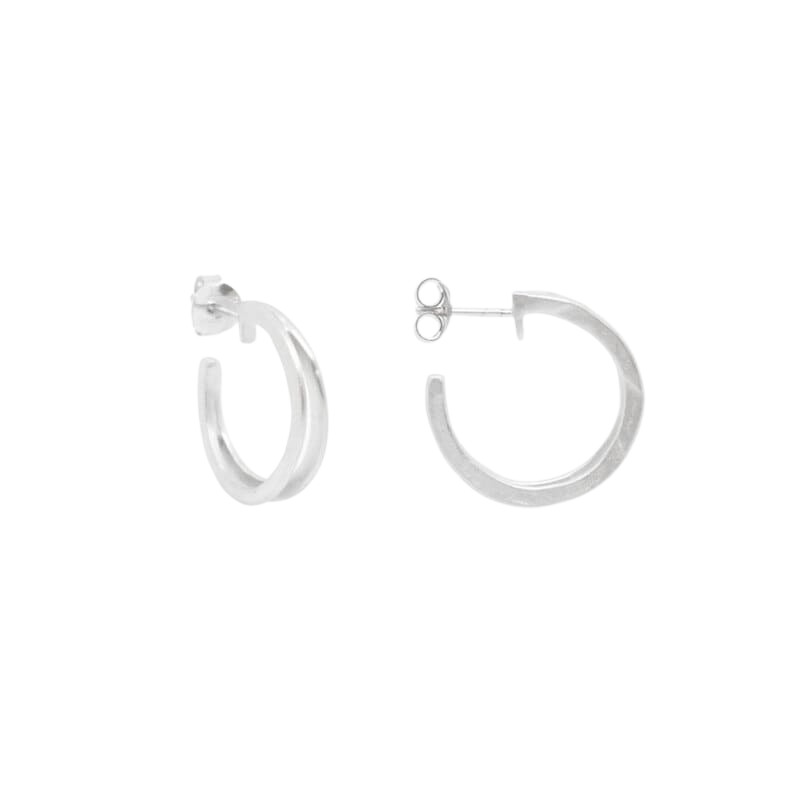 Double Mir M sind die perfekte Wahl für alle, die originelle Kreolen in kompaktem Format lieben. Handgefertigt aus 925er Sterlingsilber und mit einem matten Hammerschlag-Finish versehen, überzeugen diese Ohrringe mit feiner Textur, eleganter Bewegung und einem klaren Design.