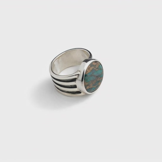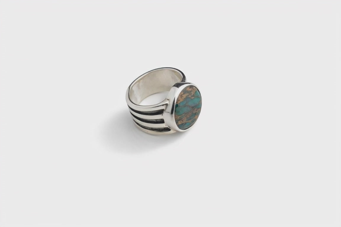 Dieser handgemachte Ring aus 925 Sterling Silber besticht durch sein kraftvolles Design und den ovalen Naturstein mit einzigartiger Maserung. Die markanten Linien an der Ringschiene verleihen ihm einen charakterstarken, zeitlosen Look. Jeder Ring wird in sorgfältiger Handarbeit gefertigt – leichte Unregelmässigkeiten sowie Abweichungen in Struktur und Stein sind möglich und unterstreichen den Unikat-Charakter. Hochwertig verarbeitet, angenehm zu tragen und ideal als stilvolles Statement für jeden Tag.