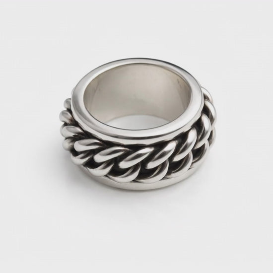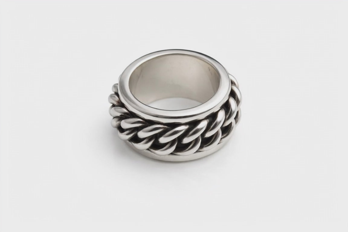 Dieser handgemachte Kettenring aus 925 Sterling Silber besticht durch sein markantes Flechtdesign und seine kraftvolle Form. Jeder Ring wird in sorgfältiger Handarbeit gefertigt – kleine Unregelmässigkeiten sind daher möglich und unterstreichen den individuellen Charakter jedes einzelnen Stücks. Ein zeitloses Statement-Piece mit Persönlichkeit, massiv, langlebig und angenehm zu tragen.