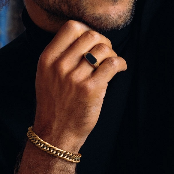 Der Ring BMW verbindet klassische Siegelring-Ästhetik mit einem modernen, urbanen Twist. Gefertigt aus matt goldfarbenem Edelstahl, zeigt sich dieser Ring im leicht nach oben verbreiterten Design – kraftvoll, aber stilvoll zurückhaltend.