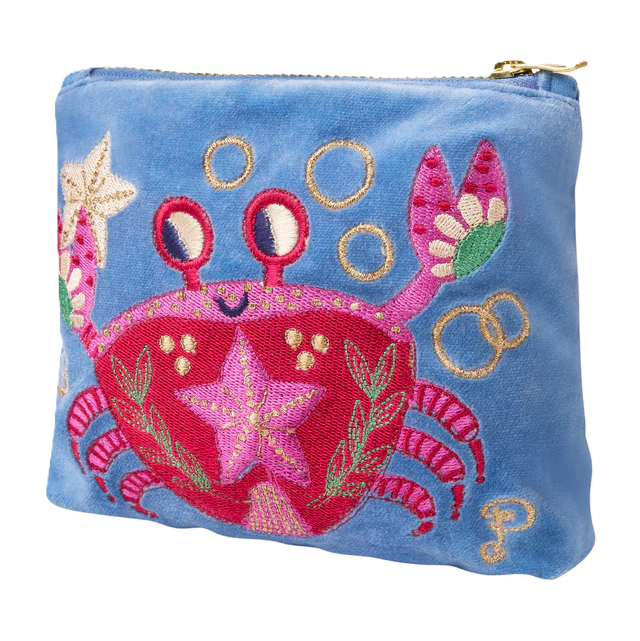 Tauchen Sie ein in eine Welt voller leuchtender Farben und detailverliebter Stickerei! Die Mini Pouch „Crab“ bringt mit ihrem fröhlich tanzenden Seefahrer-Krabbenmotiv auf weichem, luxuriösem Samt ein Stück Ozean in Ihren Alltag.