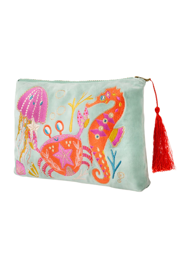 Velvet Zip Pouch „Seashore Friends“ – Maritimes Design trifft luxuriöse Stickkunst
