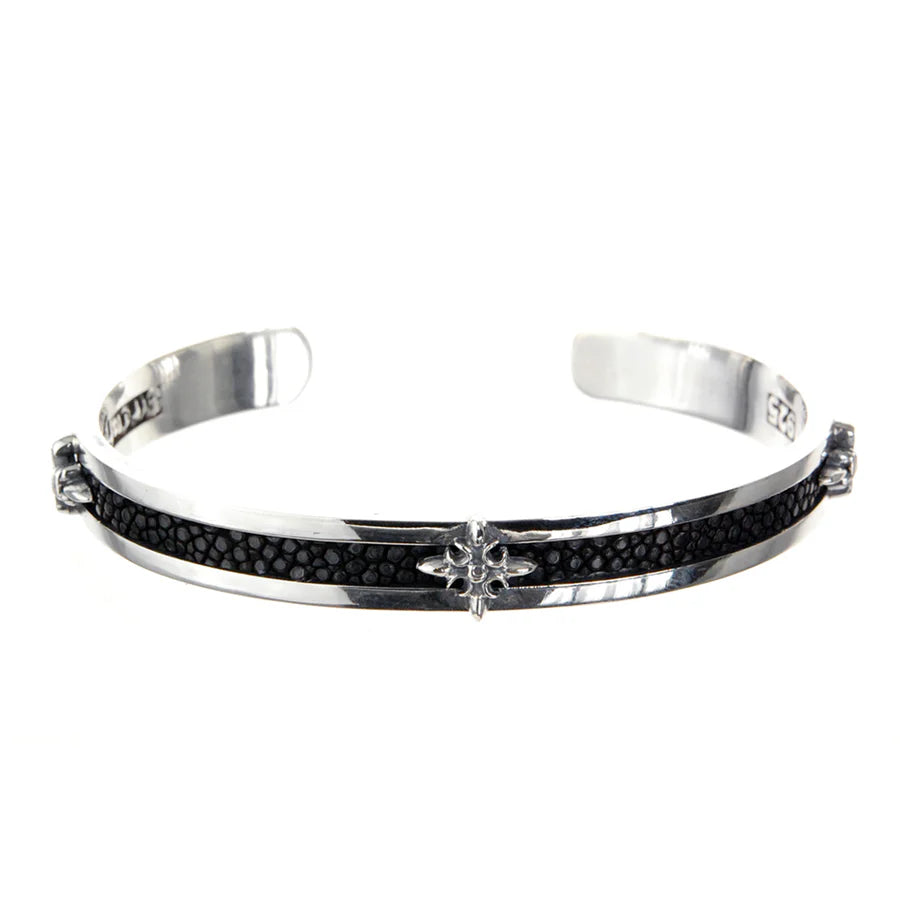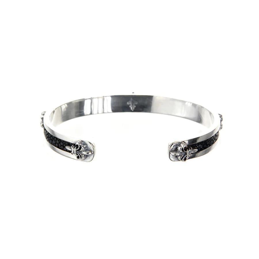 Der SEARAY Armreif vereint kraftvolles Design mit zeitloser Eleganz. Handgefertigt aus hochwertigem Silber und verziert mit schwarzen Rochenleder-Streifen, besticht dieses Schmuckstück durch seine edle Haptik und seinen außergewöhnlichen Look. Zarte Lilienornamente sowie ein zentrales Halbmond-Stern-Element verleihen dem Armreif eine mystisch-symbolische Tiefe.