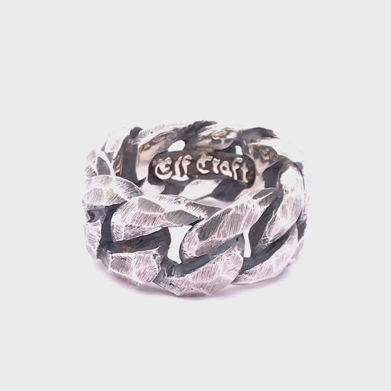 Dieser markante Ring aus 925er Sterlingsilber überzeugt durch seine kunstvoll gearbeitete Eisenschmiede-Optik. Facettierte Panzerkettenglieder schmücken das Design und verleihen ihm eine kraftvolle, maskuline Ausstrahlung.