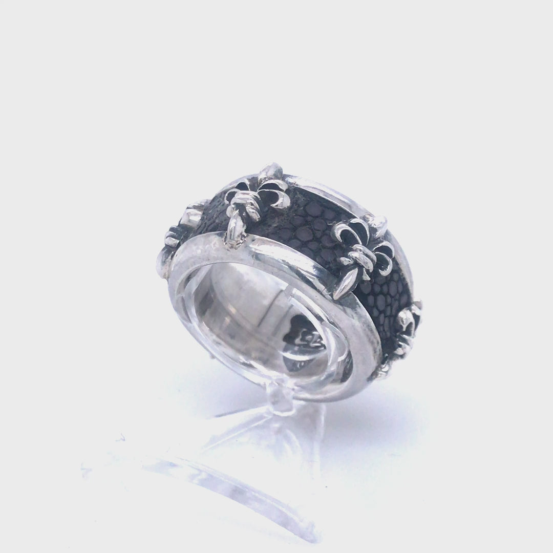 Design: Silberring mit Lilienmotiv, besetzt auf Searay-Leder