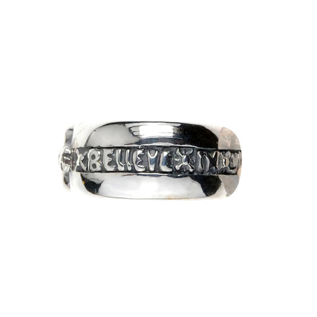 Dieser besondere Silberring vereint zwei kraftvolle Elemente: eine zarte Elfen-Lilie – Symbol für Reinheit, Hoffnung und spirituelle Stärke – sowie den plastisch gearbeiteten Schriftzug „Believe In Your Dreams“, der sich fliessend um das Band legt.