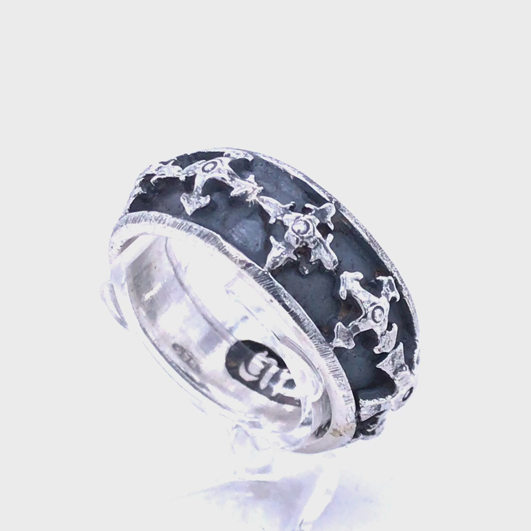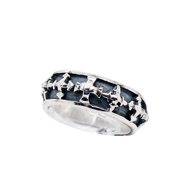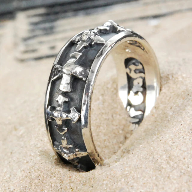 Die stilisierten Kreuze stehen für Glaube, Schutz und persönliche Stärke – ein bedeutungsvoller Begleiter für den Alltag oder besondere Anlässe. Die klare Linienführung und die handwerklich geprägte Struktur machen diesen Ring zu einem charakterstarken Accessoire für Männer mit Haltung.