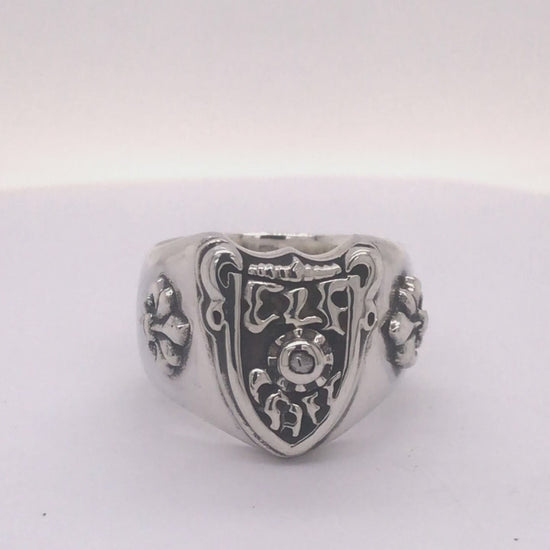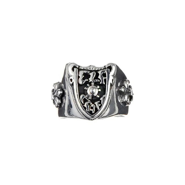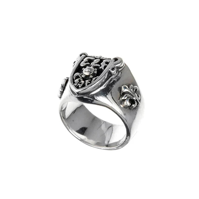 Dieser kraftvolle Silberring vereint historische Symbolik mit einer Prise kosmischer Mystik. Im Zentrum steht ein aufwendig gearbeitetes Wappenschild, das nicht nur Schutz und Beständigkeit symbolisiert, sondern auch ein echtes Meteoritenfragment in seiner Mitte trägt – als Verbindung zwischen Erde und Universum.